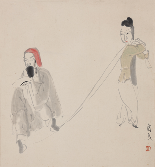 关良的“游龙戏凤”描绘的是明武宗故意踩着李凤姐腰带,逗趣的一幕。他曾画过许多张《游龙戏凤》,可见其对这个主题的喜爱。文学家茅盾、老舍都曾为他画的《游龙戏凤》题词。