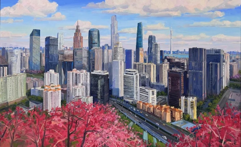 一个城市的面貌,其实是给人第一视觉印象、视觉感受的景观。我想要体现新时代广东的发展,我想应该把描绘广东的城乡建设作为一个切入点。我没有很多时间深入广东各地,于是就以我在广州城市踏访的感受画了一幅油画。