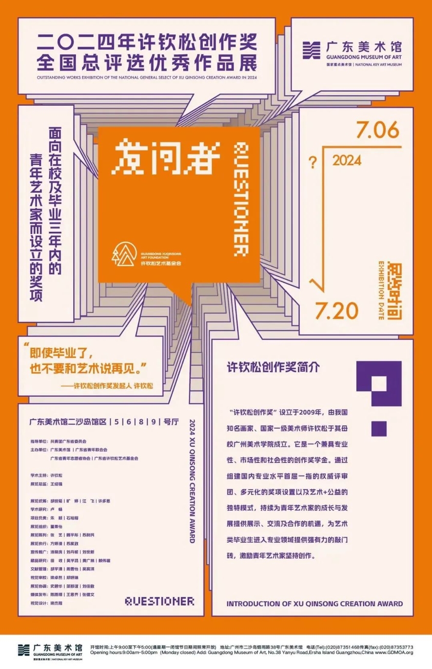 "许钦松创作奖"设立于2009年,由中国美术家协会顾问、中国艺术研究院研究员、国家一级美术师许钦松于其母校广州美术学院成立。"发问者"是对2024年"许钦松创作奖"全国总选入围作品的集中展示,参展作品来自全国九大美院及各大高校,涵盖国画、油画、版画、雕塑、水彩、影相等多个类别。此次入围作品需在各大美术高校评审委员会及美术界权威专家们的层层遴选下进行评选,一定程度上汇聚了国内最优秀的一批艺术毕业创作新秀,可以说是艺术毕业生进入专业领域强有力的敲门砖。