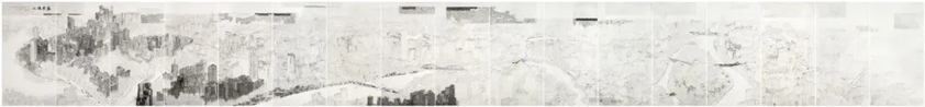 作品以珠江流经广州主城区为主线展开,画面从白鹅潭起始贯穿整个广州城区一直延伸到南沙的出海口,桥梁、中轴线主建筑群等现代元素形成横竖交叉、高低起伏、长短相依的线条,构建出如交响乐韵律般的节奏感。这幅作品不仅是对广州城市风貌的生动再现,更是中国画向当代形态转变的一次成功尝试,展现了新时代中国画家对传统文化与现代生活融合的思考与实践。