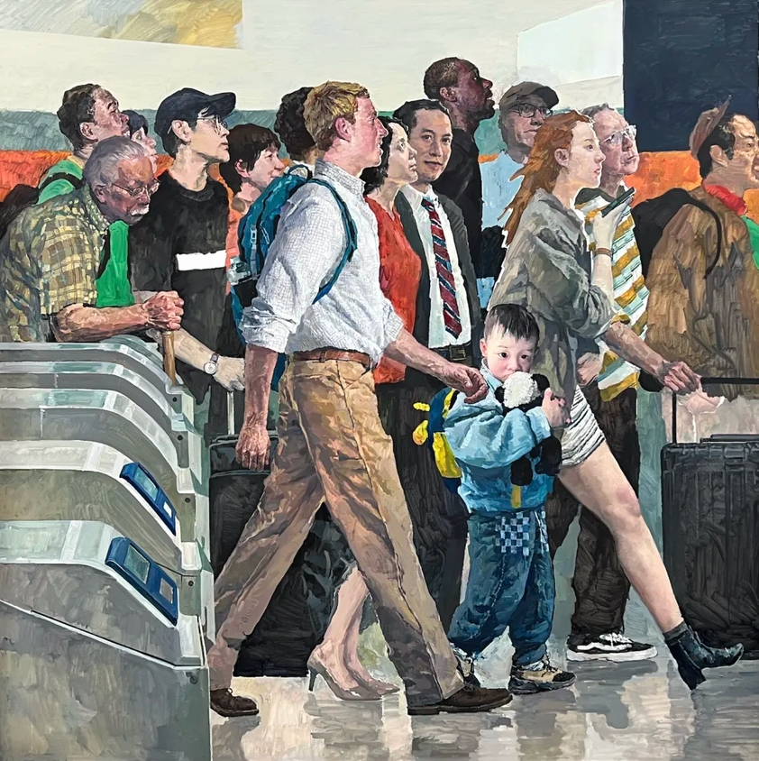 画家经过细致采风和大量的草图实验后,最终选择以布画油画的形式,描绘在口岸通关的熙熙攘攘人群。2米见方的大画细节生动,人物形态各有特点。画面中,人物形态各异,细节生动,笔触浓烈而狂放,既保留了写实的精准,又融入了浓烈的情感色彩。李晓林通过这幅作品,不仅记录了一个时代的场景,更深刻地反映了人们在新时代中的生活状态和精神面貌。这幅画以其独特的艺术魅力和深刻的社会内涵,成为当代美术创作中的佳作之一。