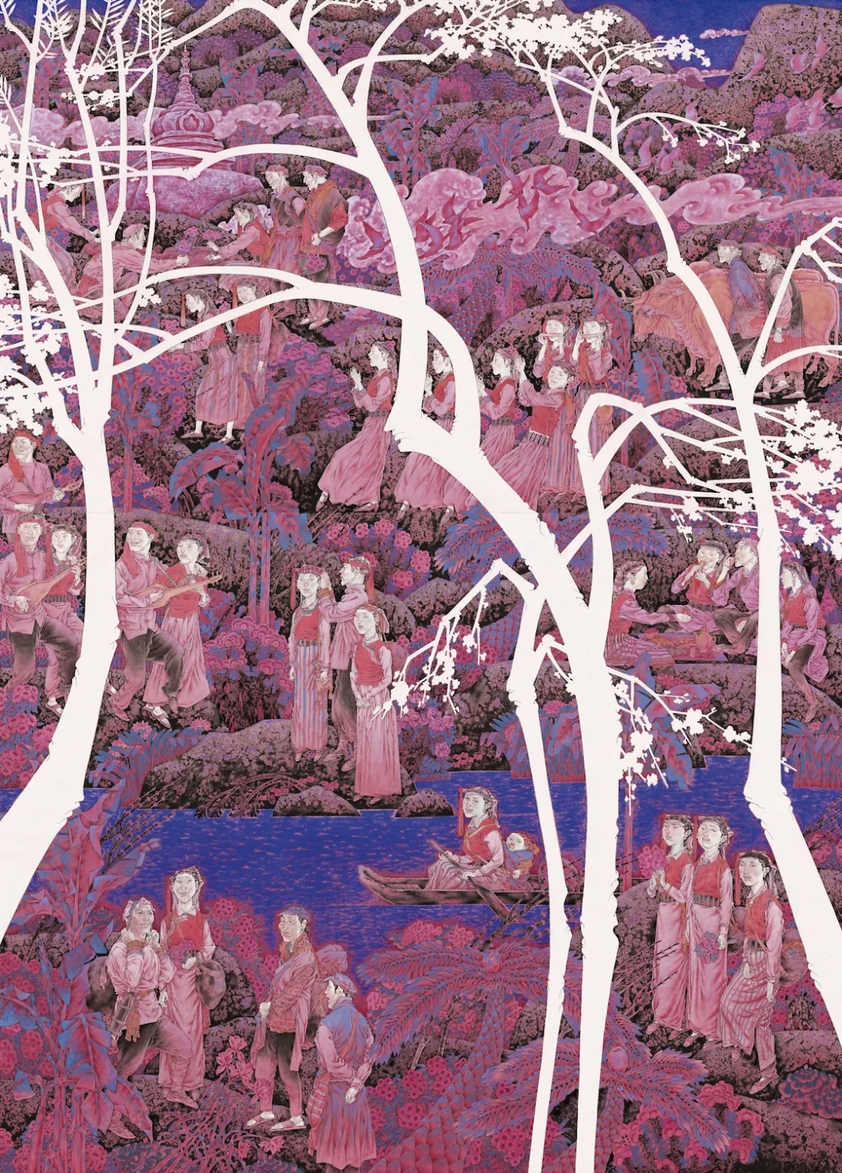 中国工笔画协会会长陈孟昕先生以往的作品以少数民族主题为主,这是较少的以城市生活为题材的创作。画作以中国工笔重彩的形式,表现游客在香山赏红叶的情景,体现绿美山河主题,极具特色。画面中的每一个细节都充满了生机与活力,仿佛能听见画中人物内心的欢歌笑语,让人感受到生活的美好与希望。