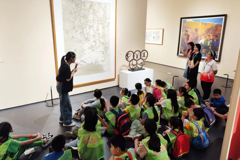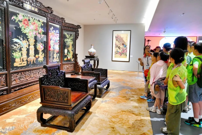 8月1日下午,首批夏令营学员们来到白鹅潭大湾区艺术中心,在简约的欢迎仪式后,大家跟随公共教育专员、工作人员和志愿者,开始了一段美妙的“双馆之旅”。广东美术馆、广东省非物质文化遗产馆两馆志愿者团队携手合作,充分运用展览资源,挖掘共存于美术作品与工艺美术作品中的“花鸟鱼虫”元素,推出“童心艺术课堂:花鸟鱼虫睇真啲”活动。学员们走进白鹅潭大湾区艺术中心,跟着广东美术馆的公共教育专员观赏中国花鸟画作品,跟着广东省非物质文化遗产馆的志愿者寻找展厅里的存在于各种器物、织物之上的花、鸟、鱼、虫元素,收集创意灵感元素,随后在艺术教师与志愿者们的引导下,共同创作童趣十足的装饰元素,完成合作作品《童心暖意·吉祥屏风》。
