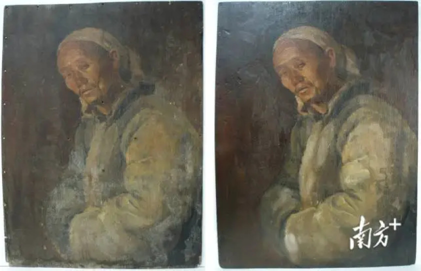 石鲁木板油画《农民像》修复前后对比。受访者供图。