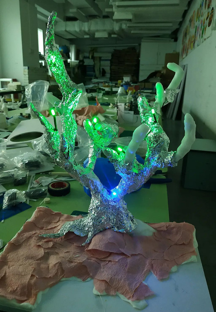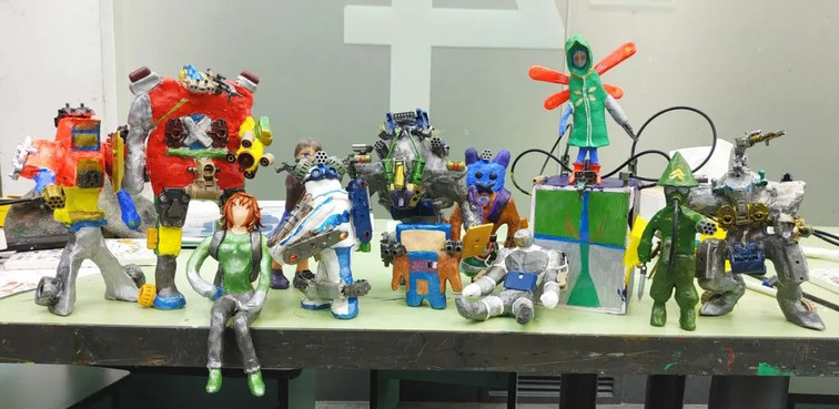 本年暑假班角色与场景设计课程,围绕着近几年十分流行的“赛博文化”作为出发点,让同学们尝试使用金属零件、塑料废品等日常材料设计具有未来特点的生命角色,以及其生存环境。