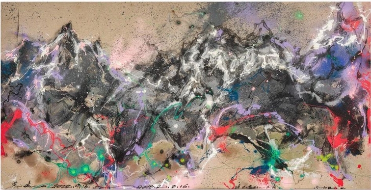 和前几位艺术家相比,陈英杰的作品来自于他在西藏和云南旅行中的见闻,只是古典和现代主义的“游记”方式,被一种工业质感的速度所替代。自然和风土的感受,汽车穿过的轨迹,现代人的一瞥,数码相机下晃动的身影,宇宙洪荒的能量轨迹,这些含混着不同时代和领域的语言,电子色、屏幕、媒介剂、加速度成为陈英杰画面的主要特征。有时,你能看到中国写意水墨的身影,有时,又仿佛置身于某个西方街头艺术的潮流之中,这些不同的元素,不再是画面中使用的形式,而是创作者的眼睛,借由这些通道,打破时空原有的顺序,激活着古老而又传统的自然文明。