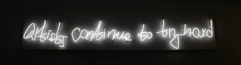 “艺术家还要再努力”是杨诘苍2007年为他上海的个展所创作的霓虹灯作品。手书霓虹灯运用简洁且幽默的手法,一方面“还要再努力”折射出艺术创作中的热情与自我要求,另一方面作品意味着艺术的千变万化的力量。