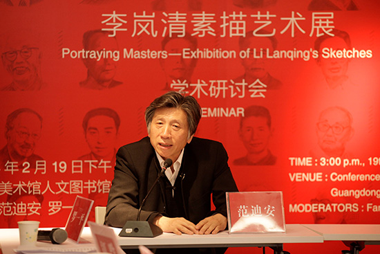 2月19日下午,“我为大师画素描—李岚清素描艺术展”在广东美术馆举行。研讨会由范迪安、罗一平担任学术主持,中国美协副主席、广东省文联主席、广东省美协主席、广东画院院长许钦松,高等教育出版社社长苏雨恒,西泠印刷出版社社长江吟,星海音乐学院院长唐永葆,高等教育出版社重点著作编辑室主任马俊华;广东省美协副主席、广州大学美术学院院长汪晓曙;广州美术学院造型艺术学院版画系主任李全民;华南师范大学美术学院教授林钰源;广州美术学院教授孙黎;中山大学传播与设计学院教授冯原;广东省文化厅艺术研究所所长梅晓;原广东省书法家协会副主席周树坚;红线女艺术中心书记蒙菁等专家学者参与了研讨。