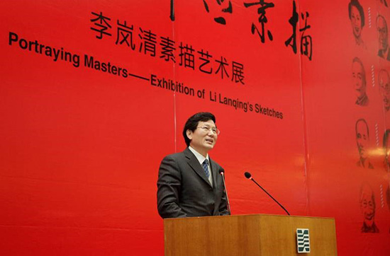 中国美术馆馆长范迪安代表美术界、广东文艺界向李岚清同志表达崇高的敬意,祝展览圆满成功,他在致辞中指出李岚清同志的素描艺术展在广东举办这是广东文化界的大事,也是美术界的盛事,并从三个方面概况了李岚清同志素描创作的价值。首先,李岚清的素描创作有一个崇高的思想,即通过艺术形式新的创造来推动整个社会对文化更新更深的认识。“我为大师画素描”是李岚清同志近年来一个集中的创作主题,他用素描的方式为近现代中国一大批文化艺术名师名家造像,超过了传统中关于“塑造”的概念。因为这一大批近代以来的名家,是我们中华民族伟大复兴道路上的重要代表,尤其是他们的作品对中国现代文化的开端、发展起了重要的作用。李岚清同志对这批人物高度重视,尊重他们为大师,而且通过自己的创作要求我们永远不要忘却大师,所以这个素描展的总主题是对我们优秀民族文化的弘扬和推广。第二,李岚清同志采用素描这种最朴素、最直接的形式来刻画形象、塑造形象,使得素描这种形式有了一个新的普及的程度。如何为大师画像,李岚清同志做了很多精心的研究,他在素描这种最本质的描绘过程中,注意到了“形神兼备”这个最根本的要求,尤其注意体现人物的性格特征。另外,系统地来画一大批近现代以来的文艺名家,还是第一次,这就构成了李岚清同志这个系列作品中崭新的主题和崭新的面貌。第三,这批创作是新的探索。李岚清同志不是一般的素描,而是在宣纸上画素描,为每一位文艺大师专门写了诗词,同时用书法写在素描肖像旁边,还为每位人物专门进行篆刻。每件作品是完整的诗书画印合为一体的新的形式。这种综合载体的形式,不仅让人可以观赏,还可以阅读,即看画又读诗词,由此通过作品让观众能够进入前辈大师的人生和创作,像阅读中国近现代文艺发展史一样来获得更多的感受。可以说,李岚清同志的素描艺术,开创了用艺术的形式来反映我们民族的优秀文化传统,为推动今天文化艺术的传布做出新的奉献。