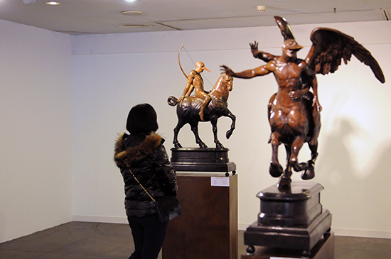 本次“身•景”中展出的作品分为几个系列,从中我们可以一窥艺术家的创作思路。系列一是具有寓意性的人物和精灵;系列二是男性人体,展示其生命内涵和身体随时间衰老的变化;其他还有两者结合而成的作品。马林雕塑有一个显著特征就是大多以具有精心构思的中心人物作为整件作品的轴心,平衡整个雕塑结构。他并不追求雕塑的对称性,在他看来,不对称性才是生活的常态。他的作品是古典手法与现代主题的交相辉映。他常用带翼的男子来表达如鸟儿般自由飞翔的梦想,或者用太阳穴上安有帽翅或戴着有尖喙的面具的人体来暗示飞翔的梦想。他以富于奇幻想象的手法创造的体操、跳水运动员或者鸟人、天使等古代神话形象表现了人体的健美与活力,体现了一种浪漫主义情怀和追求完美人性的美学理想。这使豪尔赫•马林成为跨越国界并为世界所认同的一位出类拔萃的墨西哥雕塑家。
