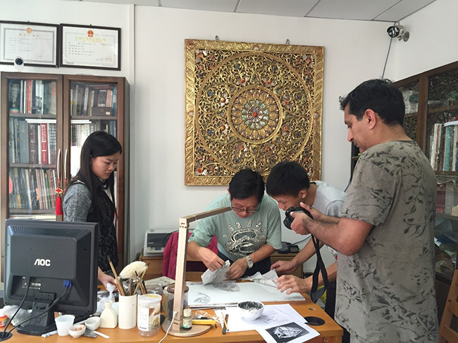 艺术家普拉尼特·索伊和本地广彩艺人在研究图样