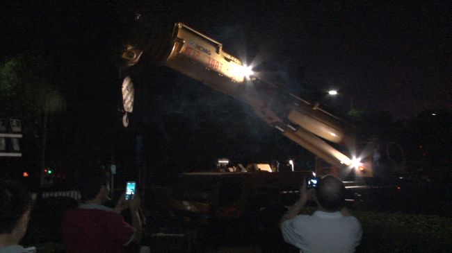8月16日晚,原本陈设于我馆中庭雕塑园的雕塑《大刀进行曲》被巨型起重机吊起,运往北京展出。当天晚上,我馆副馆长江郁之在现场指挥工作。由于此件雕塑是全铜制的,重量相当大,为起吊工作增加了非常大的难度,相关工作人员耗时近5个小时才完成雕塑的起吊工作。