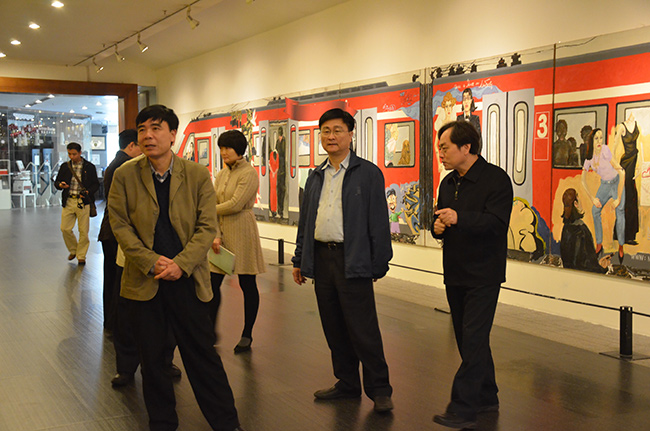 方健宏厅长先是参观了2月11日开展的“机构生产——广州青年当代艺术生态考察”展。罗一平馆长介绍:广东美术馆策划“机构生产——广州青年当代艺术生态考察”展主要目的是想为本土的当代艺术起到一个引导性的作用,为有思想、有理想的青年艺术家提供平台和支持,引导健康有序的当代艺术生态,从而保证广东持续发展的文化生产力。同时,由于此次展览呈现出来的作品都是鲜活的、积极向上的,方健宏厅长也表示由此可以反映出广东本土的艺术家是比较沉稳的、不浮躁的。