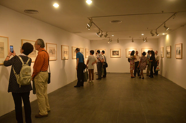 本次展览艺术家夏立业在茶叙中发言表示,本次展出的作品都是上世纪六十年代到八十年代的东西,为了把话剧从剧本搬上舞台,他跑遍了祖国的乡村山野,到生活中去搜集素材,记录了中国共产党所缔造的中国人民军队所战斗过的地方。他还介绍道,他在剧团工作的40年来,设计了30多个戏的舞台,本次展出的“南海长城”“ 秋收霹雳”“ 北上”便是其中的代表,希望能通过本次展览回顾一下30多年前的工作历程,与同行战友、朋友们战斗历程的美好记忆。