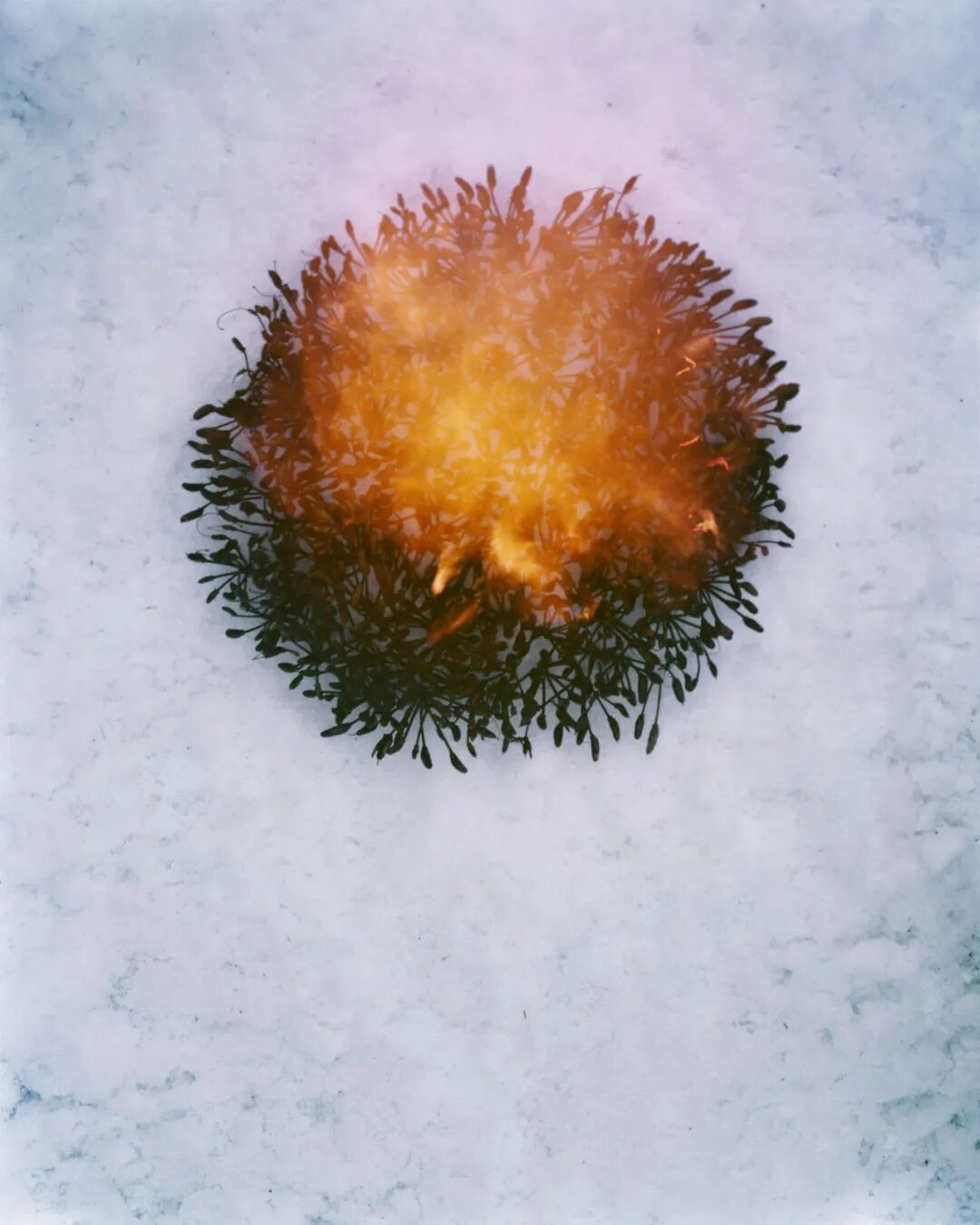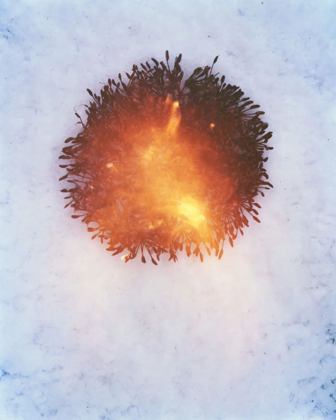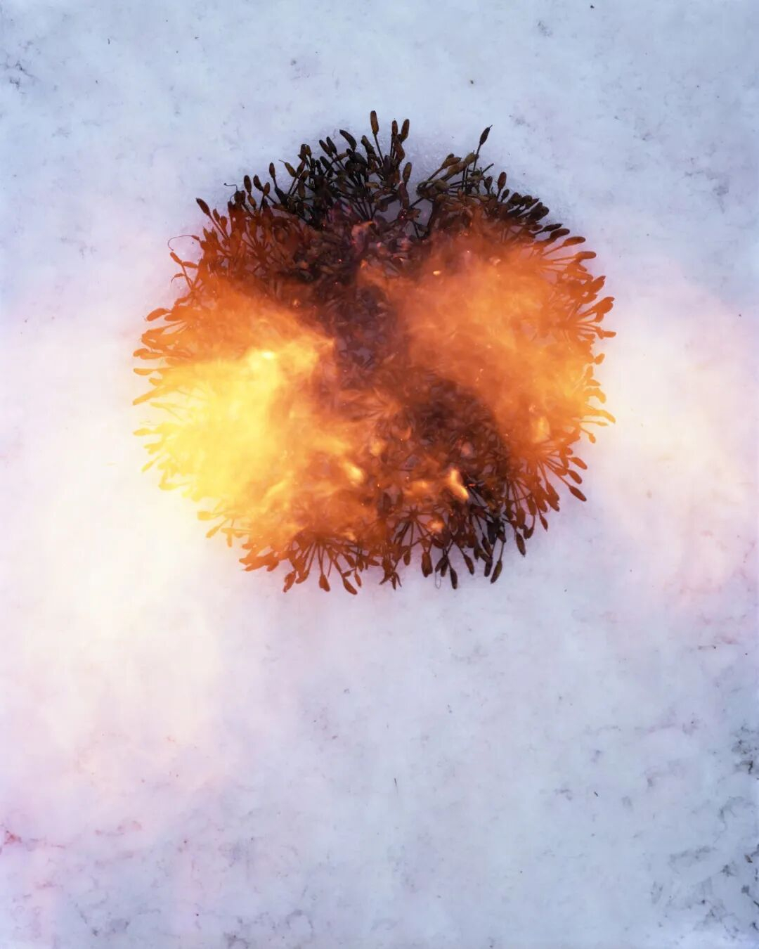 在一年的时间里,王岩多次探访兰开夏郡一处废弃矿场上的同一株杜鹃花。冬季,她收集其种籽,带回位于约克郡的工作室,将其放在雪地上点燃——这是一个兼具毁灭与新生意味的行为:火既能用于抑制植物生长,也是(生命)再生的必要条件。