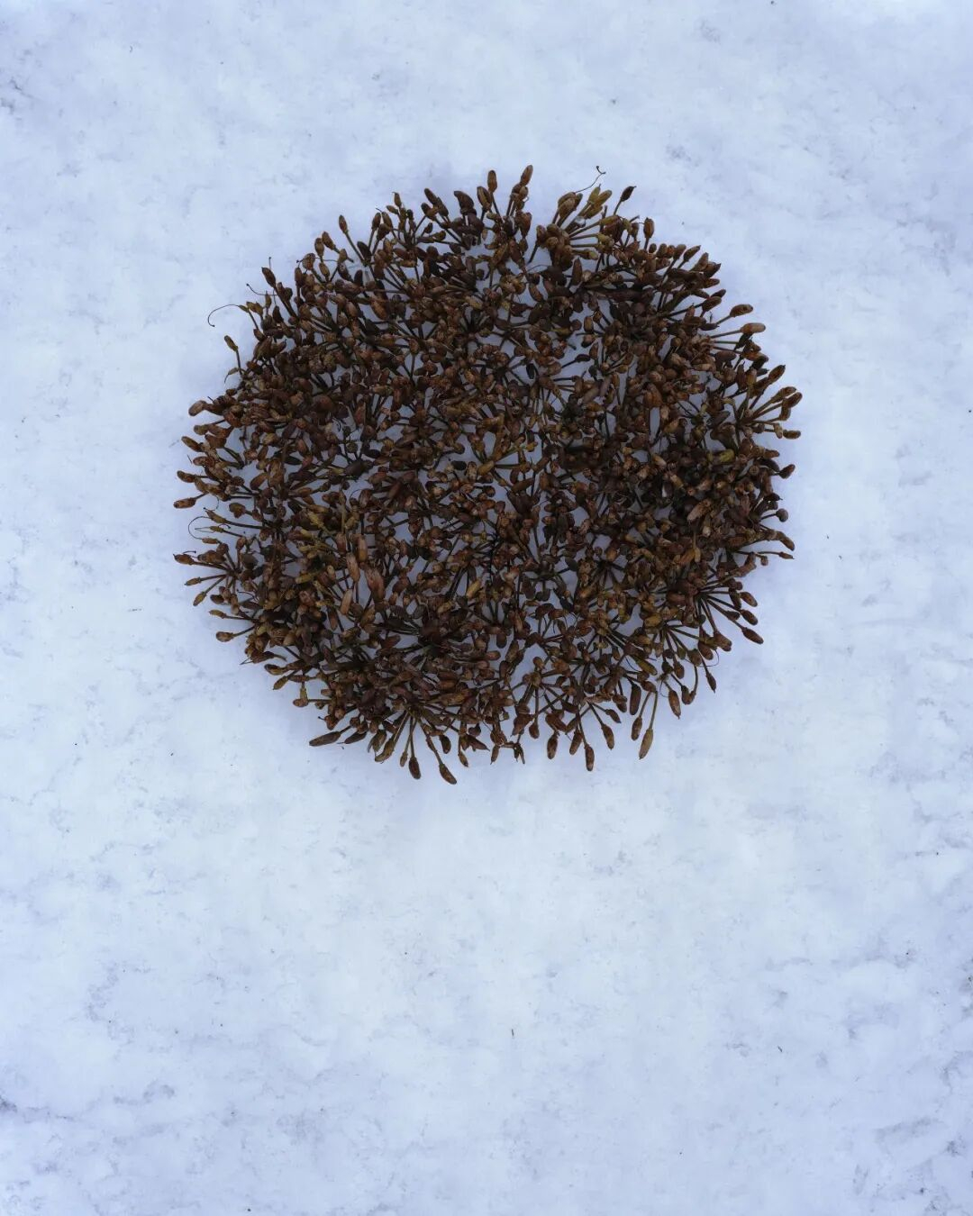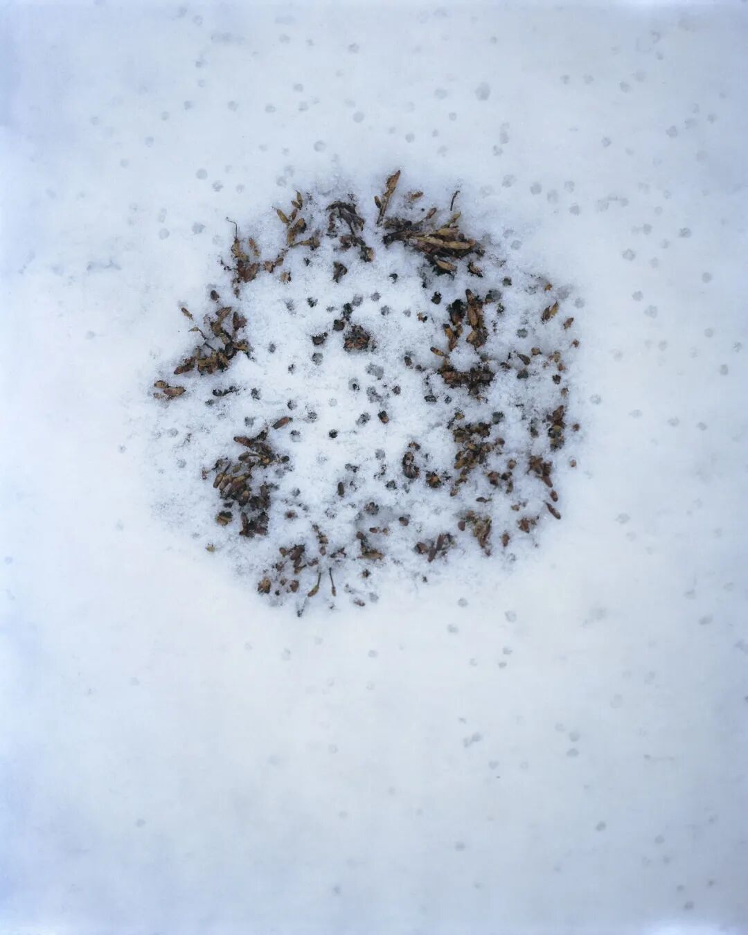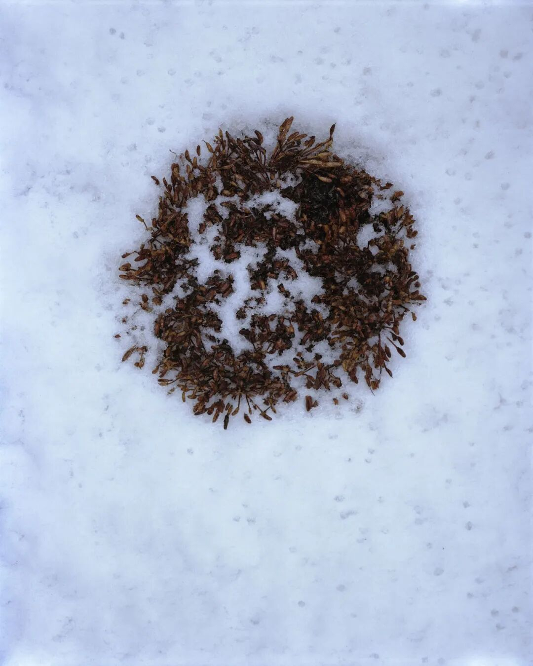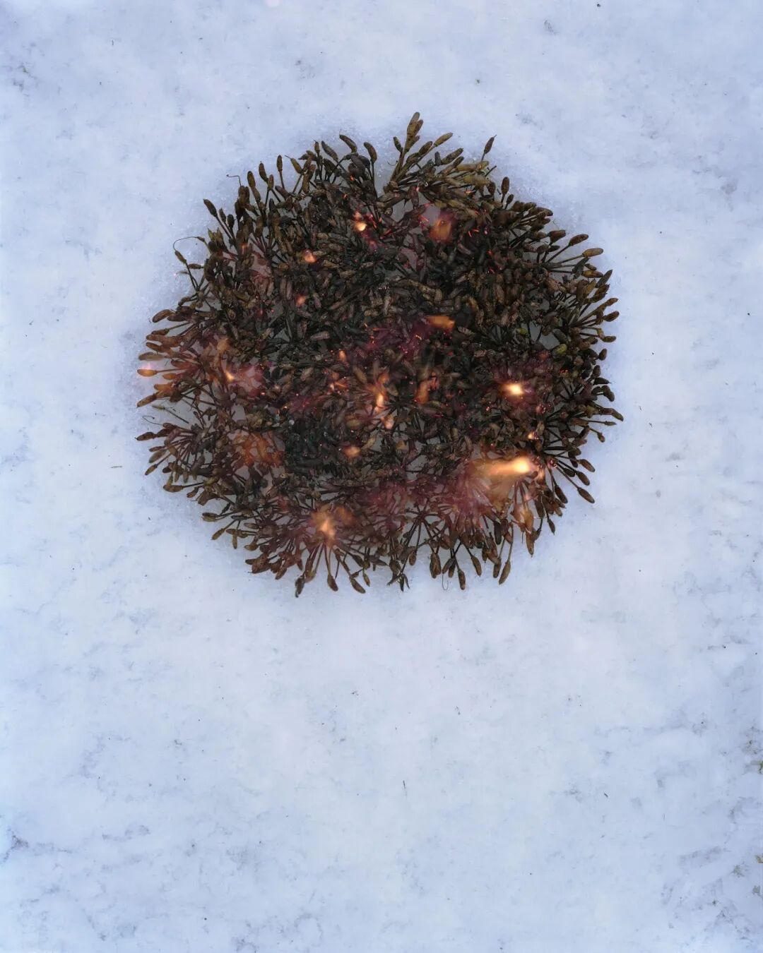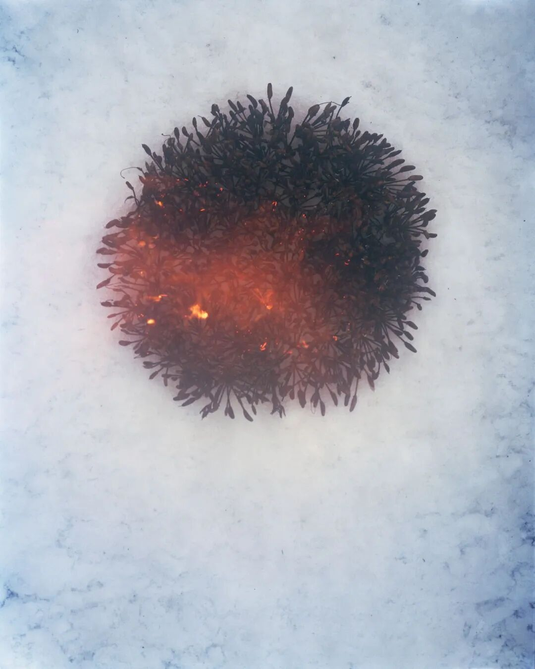 Over the course of a year, Preston visited a single bush on a post-mining site in Lancashire. In winter, she gathered its seed capsules, brought them to her Yorkshire studio, arranged them on snow, and set them alight — an act of both destruction and renewal. Fire is used to suppress plants, is also essential for regeneration.