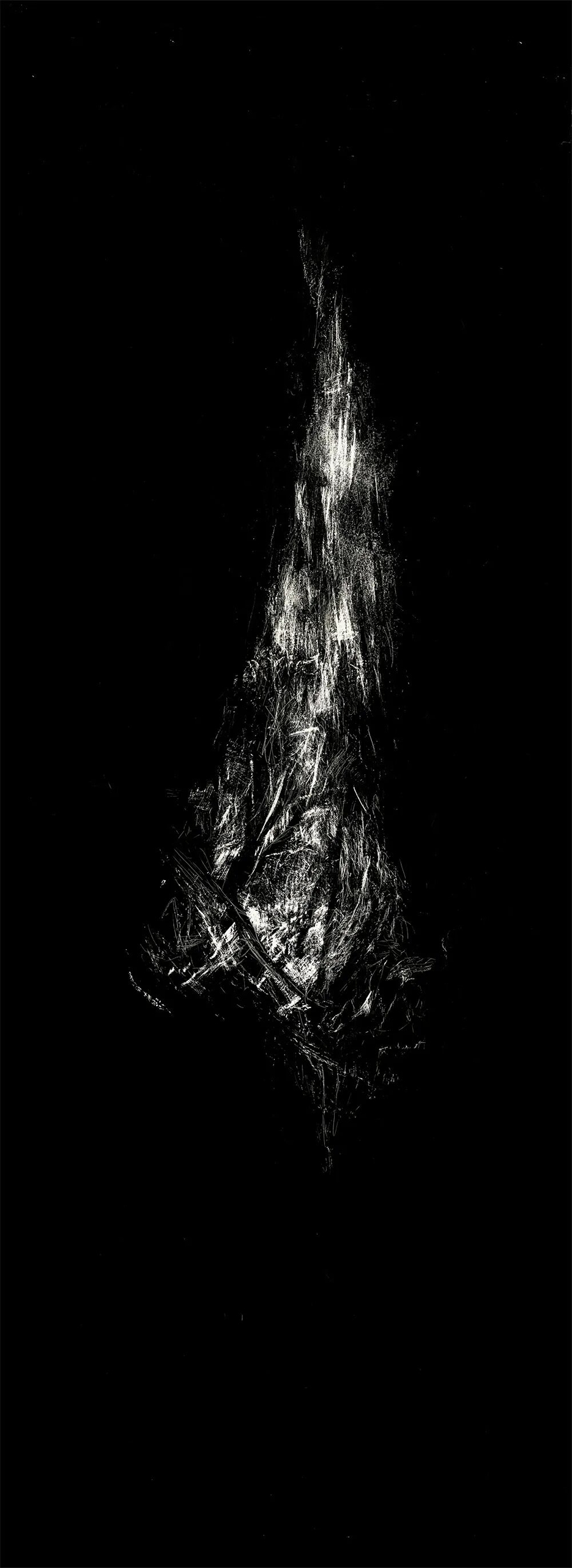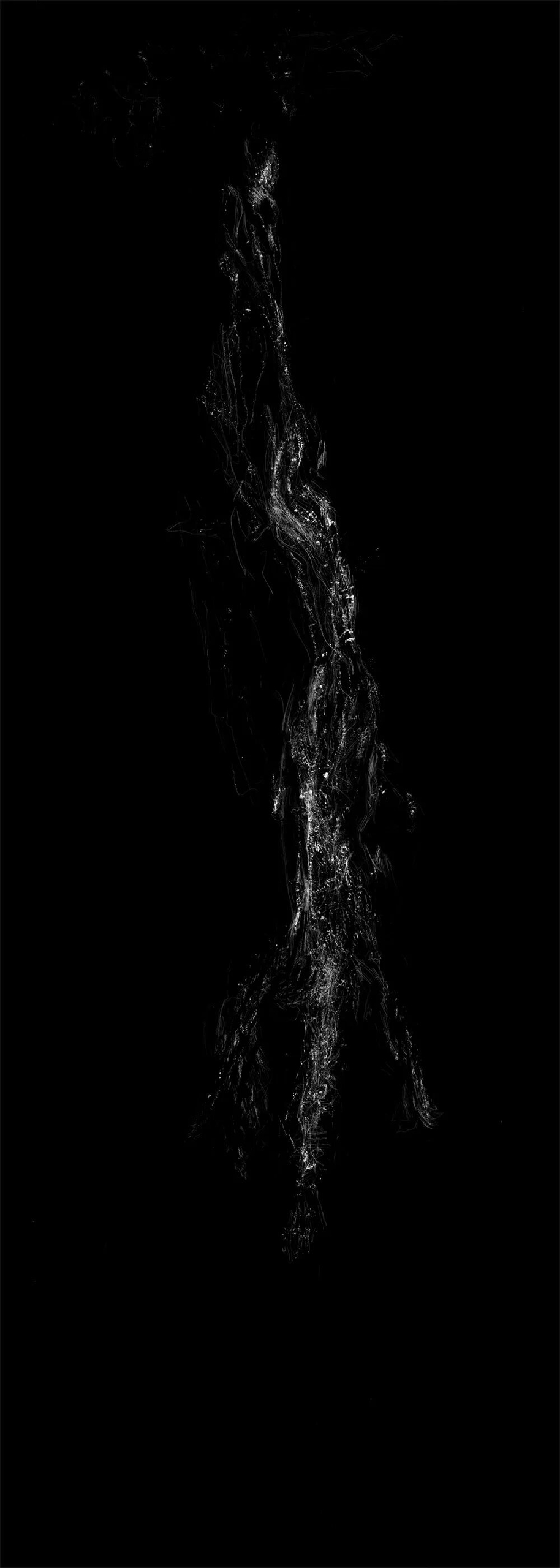 瀑布在中国山水画中是一个重要元素,“疑是银河落九天”映照着这天地间的造化。本系列作品以胶片为绘画媒介,划去胶片的银盐底色,依照亮光来应和这大自然的性灵。胶片的黢黑静默与瀑布的流转飞光间的内在张力自然呈现。在计黑当白的反向成像中,虚实相生;在山水符号间坐卧,游目骋怀。于静观中照见自在,印记历史与自然交织的存在。