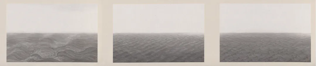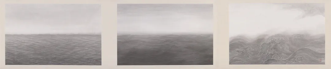 这是王牧羽2017年创作的当代水墨十二联作品。王牧羽2015年结束其此前的“云图”系列创作,以全新的语言完全转向“水图”系列。转向的契机是2015年北京故宫博物院武英殿晒画,展出了南宋马远的《水图》卷。近距离面对马远的水图让王牧羽产生在生宣纸上用水墨语言重新阐释马远水图的想法。王牧羽用一年多的时间反复试验,最终完成了这个挑战。是作者以马远水图手卷为对话文本创作的同形手卷的第五卷,标志着王牧羽水图造型语言的探索成熟。作品纯以生宣纸的洇化特性替代传统绢本墨线勾勒技法,通过控制水墨在生宣上的洇化轨迹形成水纹线条。画面仅保留水面图像且无题款,仅在右下角钤“牧羽”印。画心尺寸与装裱形制仿照南宋马远《水图》,以十二种独立的水纹图像,在马远原作水法排列顺序与视觉空间结构内完成新语言体系的构建。此卷与王牧羽其他存世五卷《牧羽水图手卷》不同,是其每张画心的构图在完全保留复现了马远水法同时,刻意把水面图像压缩到画面二分之一以下。这其中有向杉本博司海景作品的致敬,也有作者更深层面的观念表达。合裱一卷展开,水法万变中一线贯之。王牧羽水图经历“废纸三千”的材料和技术实验,将传统程式化水法转换为“物——物”关系的图像生成机制,凸显传统水墨语言的内在变革。该作曾于2019年在南京艺术学院美术馆的“水——王牧羽个展”及多个重要学术展览中露面。