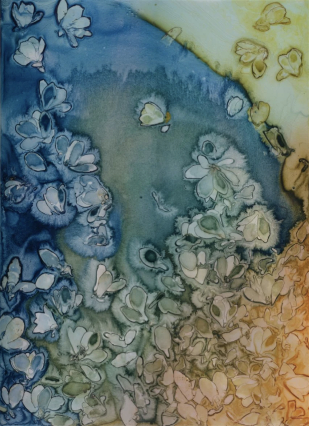 若说林间的地表以附着与沉积缓慢书写,那么水更像一种持续改写的力量:它不把世界定格为轮廓,而是以浸润、溶解、携带与再分配,使边界变得可疑,使形象从“被描绘”的意志中松动并获得释放。水从来不会把对象呈现得更清楚,相反,它让条件显形——让湿度、流速与盐分,连同不可预期的扩散与干涸,共同参与图像的生成。于是,观看在这里不再等同于单次的“看见”:出现与退隐、涨落与沉积、显影与褪色,反复教我们在不稳定中保持耐心与敏感。水还会把自身物质性的变化推进为可感的叙事,使“生成”本身走到图像的前台。