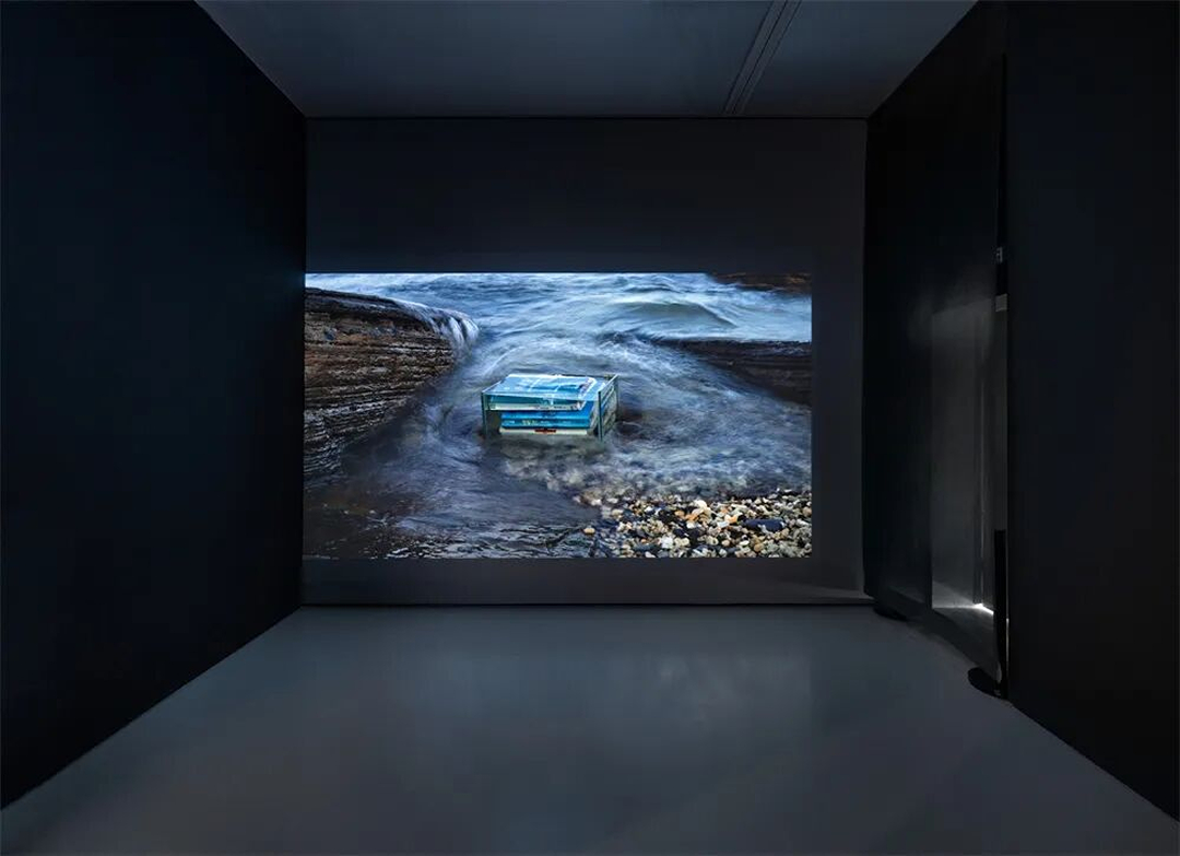 邓广燊的录像装置作品《渡海 III》(2022),记录着与大陆相连的海水、海浪拍打着放在玻璃盒中的书籍、书本干涸后留下的痕迹,回忆着母亲过往经历的同时,思考当代社会离散的根源以及人与土地的关系。