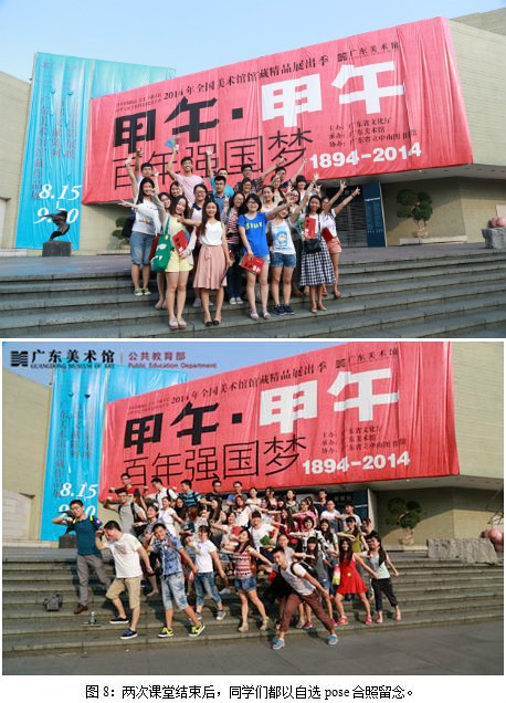 竞赛结束后,猜中最多画作的一组获得了奖品——“甲午•甲午”场刊。然后同学们纷纷重回展厅,埋头寻找最让自己有feel的画作,参加“我对你有feel”微博有奖互动。在离开广东美术馆之前,李老师还特意安排了“说出他/她的名字”小游戏,要求大家说出同学们的名字和专业,考察大家是不是真的相互认识了。