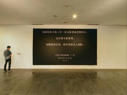 现在大家看到的,是一名英国的艺术家格拉汉姆·古辛给大家带来的作品,名为“看不到的电影”。这个作品看起来也很简单,就是以一个9*12的黑色屏幕来模拟电影院里的大屏幕。作品想传递的信息是:我们时常会因为没有机会或办法去看某些东西,而错过了它。为什么说是“看不到的电影”呢?原来,艺术家把那一场电影的所有门票都买了,其他人买不到票,就没办法进去看电影。作品中只有一句话:“这场电影的电影票都已卖光。”这是因为被遮蔽了,而无法被看见。