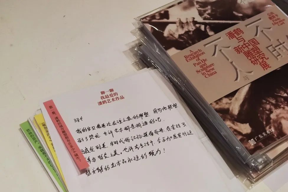 此次展览设置了“我最喜欢的潘鹤雕塑作品”互动留言区,鼓励观众在观展之后,选出心中最爱作品,留言分享。教育区放置有《潘鹤少年日记》,供观众阅读;投放留言互动卡,供观众书写畅言。展览期间共投放约5000张留言卡,回收投稿约2000张。投稿中写满了大家对潘鹤的敬佩,对展览和展品的喜爱,呼应了“以心塑像,以情动人”公共教育主题。