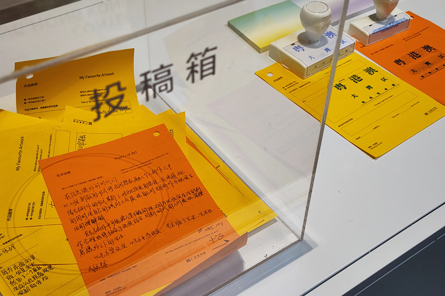 漫步在展厅中,一件件当代艺术作品触动着观者的心。在“艺游流动站”,公共教育团队用投稿创作纸和纪念印章,鼓励观众选择心仪之作进行留言推荐,或捕捉关键词创作诗文,以此与展览深度互动,发掘城市记忆与情感共鸣。