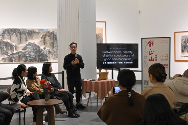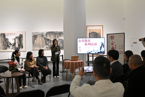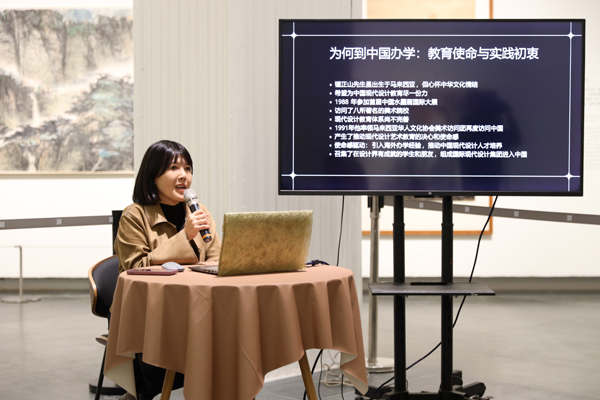 本次展览策展人锺琳从父亲锺正山的成长与学习轨迹切入,回溯了他早年在新加坡南洋美术专业学校求学经历。谈及父亲的教育贡献时,锺琳女士满含敬意。她介绍道,锺正山先生一生致力于践行“艺术与科技融合”的前瞻理念,创办多所设计艺术院校,发起国际现代水墨画联盟,以“水墨外交”促进中西文化交流等事迹,让现场听众深受触动。本次展览策展人锺璟则重点介绍了父亲在中国办学的历程,以及自己如何坚定地支持父亲的办学事业。她提及父亲办学始终秉持“以传统为根、以现代为法”,融合中国传统文化精神内涵与西方现代设计精华的教育宗旨。