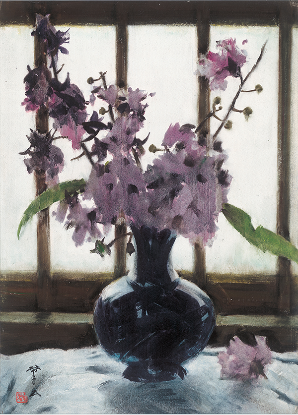 花是王肇民钟爱的绘画主题之一。其代表作《大叶紫薇》在构图形式、技法表现、水分运用等方面都很成熟,在光影处理上有独到之处。画作描绘了窗边桌上的几枝大叶紫薇花,画面采用逆光布局,物体色彩对比强烈,细节处变化丰富,整体看来既醒目又清新。干笔画的花瓶厚重深邃,湿笔画的紫薇花轻盈明丽,整个画作给人一种清新脱俗的感受。