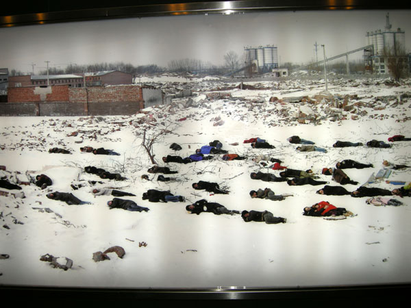 艺术家在北京的艺术区被开发商征收,断水断电断暖气要把艺术家轰走。张小涛说面对压力的时候你要抗争,用法律工具去表达你的诉求,坚持信念。他的这张照片是诉求转换成一种图像,它是一种公共的视觉经验。