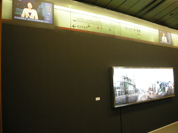 美术馆里有个地铁站?原来艺术家把公共空间地铁的背景搬到美术馆来。张小涛说把地铁放在展厅给人一种空间的变化的感觉。这么做是包含一种观看社会的角度,因为艺术家的思考的视点和一般人不一样。
