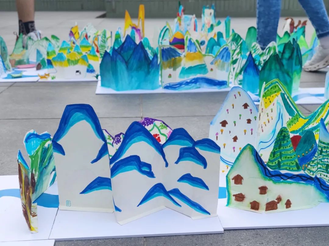 “童心创作”(儿童场)的主题是“诗中风景:轻舟已过万重山”。潘志雅老师引导大家了解中国艺术“诗书画一体”的特征,从古诗词中寻找“风景”,想象一只小船沿着珠江穿行,“轻舟已过万重山”的情景。潘老师邀请大家分享了各自的灵感诗句,构思自己心中的一段山河图景。随后老师和志愿者们通过绘画技法示范与手把手指导,带领孩子们勾勒形态各异的青山绿水,搭配充满温情诗意的山野细节,创作出40个独具个性的装置作品。