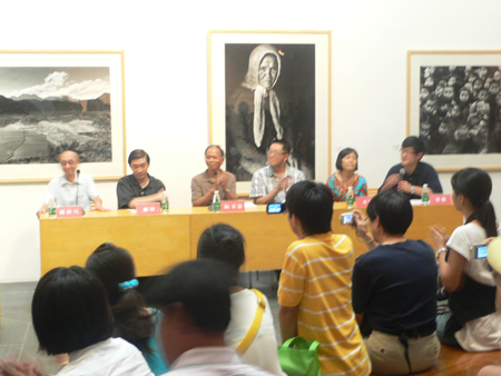 和我们讲解完毕之后,美术馆还举办了一个小型的展览座谈会,出席的人有前任馆长王璜生,策展人李媚和蔡萌,一些艺术家,当然还有我们的阮义忠先生。尽管是和很小的座谈会,但基本是座无虚席。其中颜长江老师的肺腑之言实在让大家印象深刻,他说:“阮义忠先生是一手拿相机,一手拿火把,照亮了中国摄影界的前路,有句话说,吃水不忘挖井人,时刻想念毛主席。今天亲眼看一下阮先生,是我的荣幸啊。”