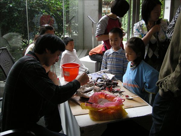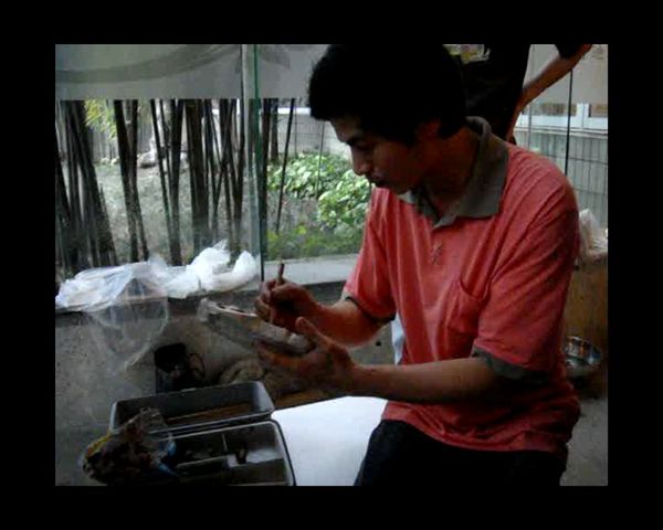 翻模师傅首先演示如何将唐老师的作品翻模。首先用胶片将卧牛划分成两半,到时候模就是从这个分界处打开的啦!师傅说分界要看作品的复杂程度。有的复杂的作品要划分成好多部分呢!