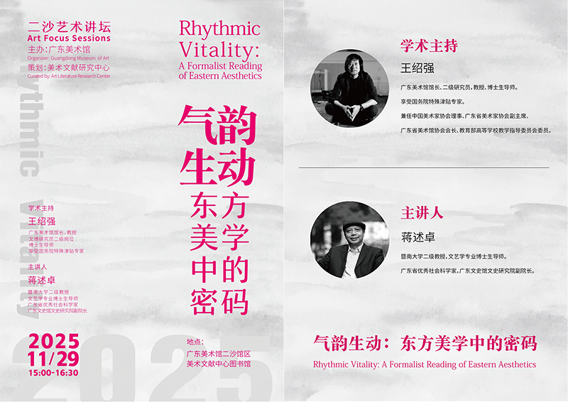 第一期“二沙艺术讲坛·艺文共振”于2025年11月29日下午在广东美术馆二沙本馆二楼的美术文献研究中心图书馆顺利举行。本期讲座以“气韵生动:东方美学的形式密码”为题,由暨南大学二级教授、博士生导师、广东省优秀社会科学家蒋述卓教授主讲。蒋教授深入浅出地从西方形式主义理论的角度切入对“气韵生动”概念的理解,从“六法”源流谈到形式主义,为我们审视中国绘画的独特旨趣提供了跨文化的新视野。