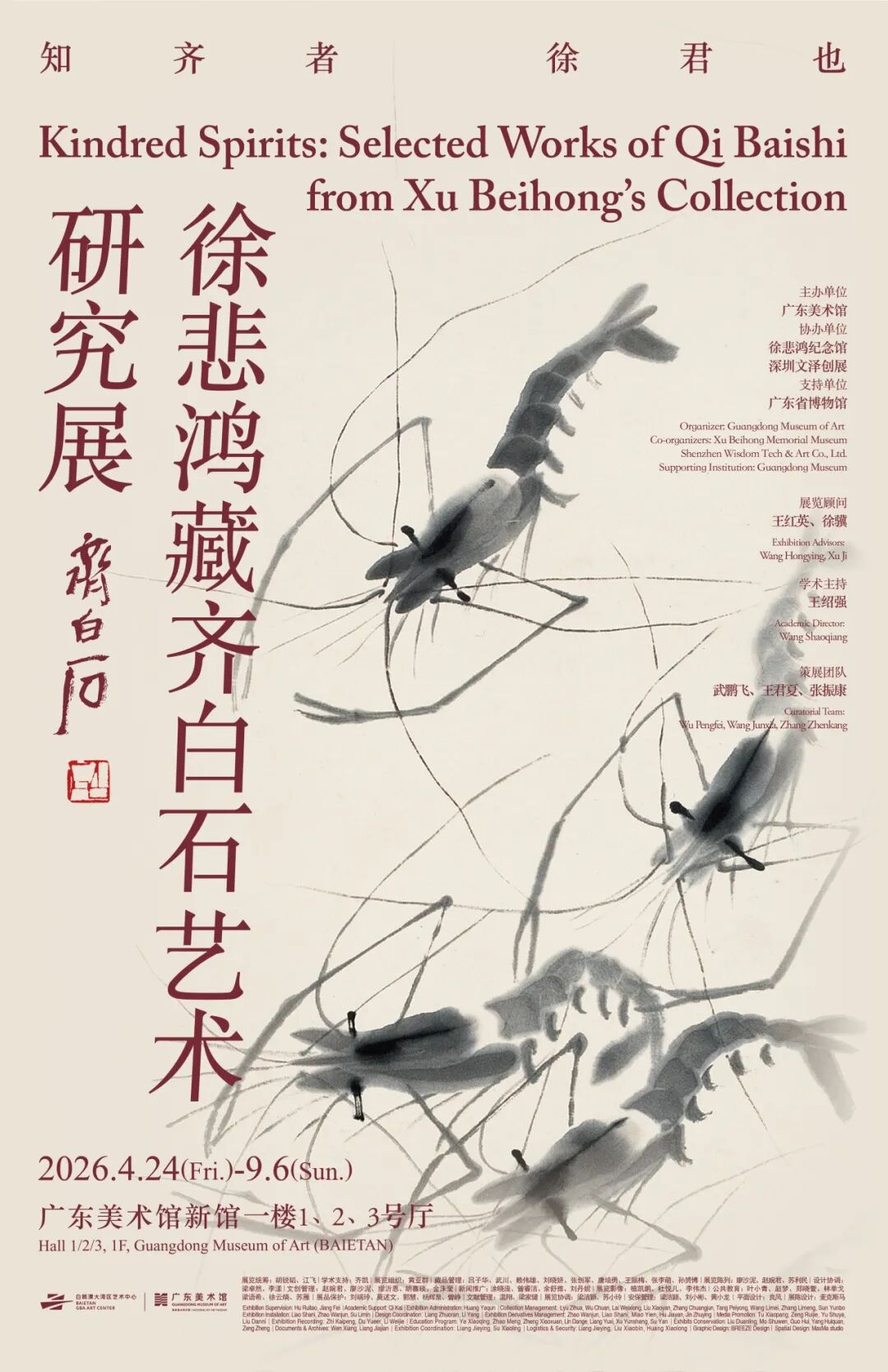 In 1956, three years after Xu Beihong’s passing away, the 92-year-old Qi Baishi visited Xu‘s family to pay his respects. With these weighty, heartfelt words, the white-haired old artist left his final annotation of the lifelong kindness bestowed by his dearest friend. Behind these short sentence lay decades of meticulous care and unreserved mutual trust and sincerity, which forged the bond transcended the realm of art. It was Xu Beihong, who, as the newly appointed Dean of School of Art of the Peking University, stood alone against public opinion and tried multiple times to invite Qi Baishi to join the faculty. It was also Xu who stood firmly by Qi’s side, wholeheartedly appreciating his pioneering spirit, when his "Late-Life Transformation" faced ridicule from the art world. These acts of support gave rise to this precious collection spanning Qi’s entire career, with the warmth of the kindred spirits, leaving one of the most touching tales of friendship in modern Chinese art history. Today, under the title “Kindred Spirits,” we present this exhibition bringing together Qi Baishi’s masterpieces from the collection of the Xu Beihong Memorial Museum, supplemented by outstanding works from the Guangdong Museum collection, forming a relatively comprehensive ensemble. We hope these unparalleled collections will serve as a key to unfolding the full scope of Qi Baishi’s art—from grand landscapes to delicate insects and fish, from freehand brushwork to seal carving. We also look back on Xu Beihong as a discerning patron, bosom friend, collector, and global advocate, giving lifelong, unwavering support and vigorous promotion of Qi’s art. We seek to understand the spiritual resonance of “harmony in diversity” shared by these two artistic revolutionaries, as well as that fervent friendship that remains glowing across a century.