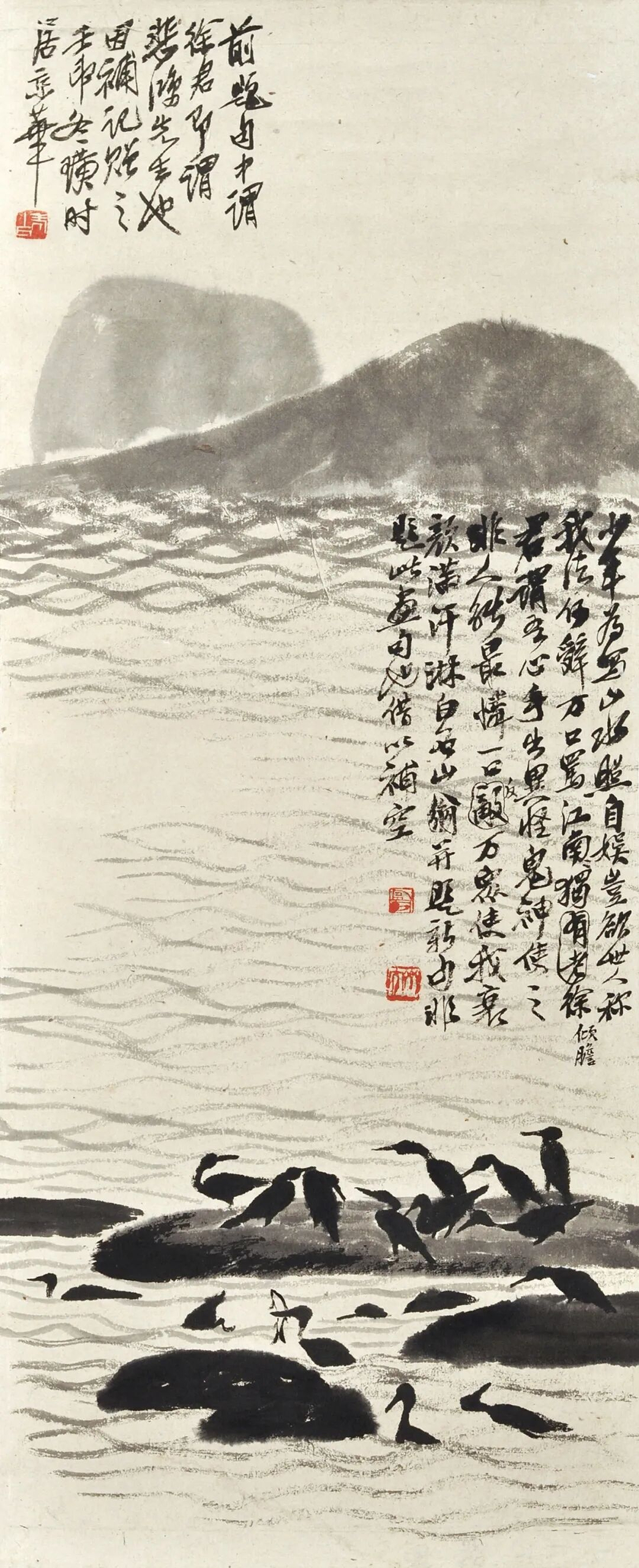 题跋(右):少年为写山水照,自娱岂欲世人称。我法何辞万口骂,江南独(有老)倾胆徐君。谓吾心手出异怪,神鬼使之非人能。最怜一口(敌)反万众,使我衰颜满汗淋。白石山翁并题新句,非题此画句也,借以补空。