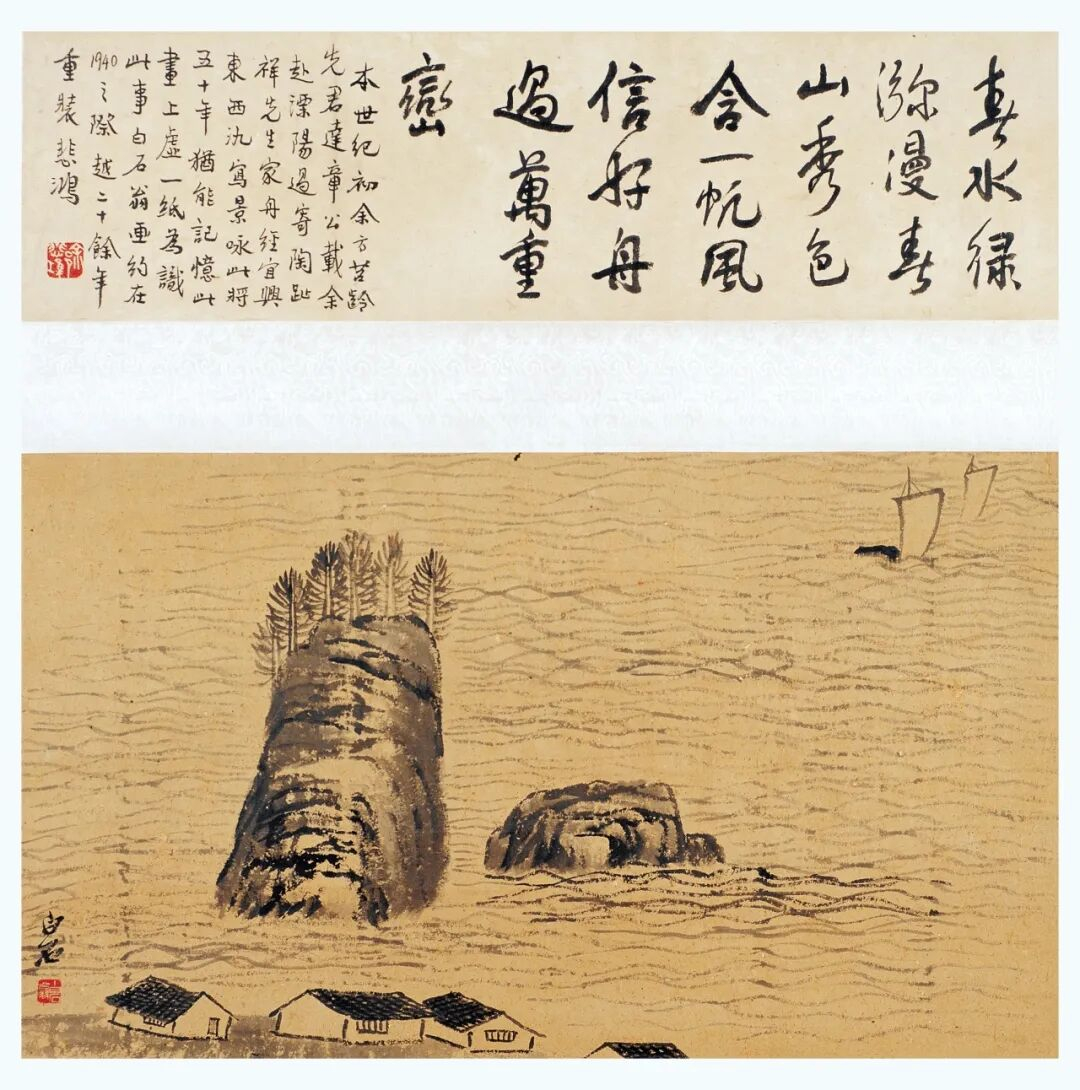 徐悲鸿补题:春水绿㳽漫,春山秀色含。一帆风信好,舟过万重峦。本世纪初,余方苕龄。先君达章公载余赴潥阳,过寄陶趾祥先生家,舟经宜兴东西氿,写景咏此。将五十年,犹能记忆。此画上虚一纸,为识此事。白石翁画约在1940之际,越二十余年重装。悲鸿。