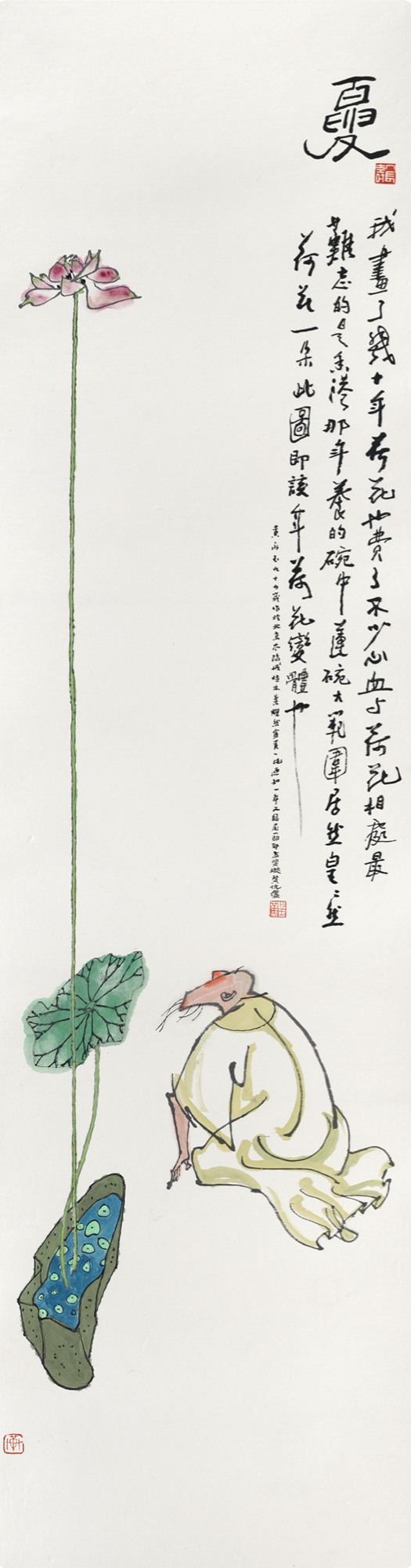 I have painted lotus flowers for decades and spent a great deal of effort living with them. The most unforgettable was the lotus grown in a bowl in Hong Kong that year. Though the bowl was small, the lotus bloomed magnificently. This painting is a variation of the lotus from that year.