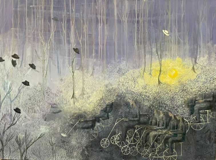 谢莉斯的作品采用凝视、瞥视、监视等各种观察的角度和方式,对现实形成多维度的剖析,从而形成了日常化的荒诞与现实交错的场景空间建构,用一种近乎布面装置的形式与观众面对面的交流。周钦珊的创作在乎用一种无限性和整体性去表现感知的无穷生命力,其作品呈现的是一种特殊的存在——感知关系,存在与知觉的相互建构关系,通过颜色、空间的变化、韵律、节奏等审美手段来呈现。卓莹则善于用夸张怪诞的氛围,出其不意的⼈与物关系和形象,营造出纷繁奇异的场景,在她超现实主义的画⾯中,这些场景既熟悉又陌⽣,是意识与⽆意识的交叠呼应,构建出⽐真实更宽⼴、更丰富的世界。