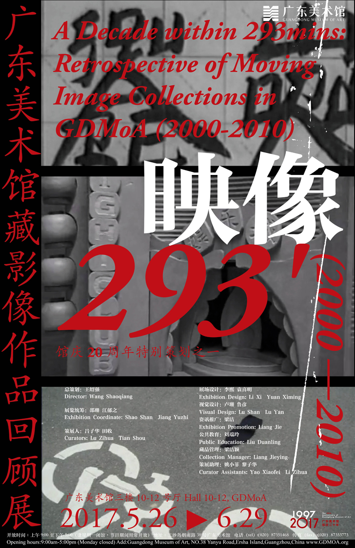 “映像293分钟:广东美术馆藏影像作品回顾展(2000—2010)”以“影像”这一媒介为切入点,对新世纪的当代艺术进行一次纵深的检阅。2000至2010年是本次展出馆藏作品的时间跨度,“293分钟”则是展出影片的时长总和,这份“时间”不但记录了新世纪中国社会10年的变迁,当影像被再次激活的时候,作品与观者产生时空交错的碰撞,这些叠加在影像之上的时间使其获得了更深厚的解读和观看经验。