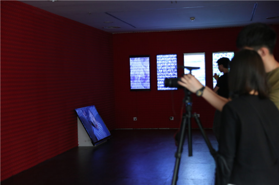 王绍强馆长与策展人刘钢和艺术家许宏翔在展览现场交流