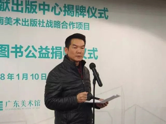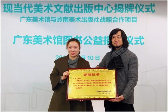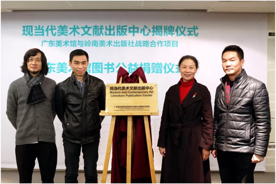 2018年1月10日下午,现当代美术文献出版中心揭牌仪式暨广东美术馆图书公益捐赠仪式在广东美术馆举行。广东省文联党组成员、广东文艺职业学院党委书记吴佳联,广东省文化厅艺术处处长唐国华,岭南美术出版社社长李建军,广东美术馆馆长王绍强,广东美术馆副馆长邵珊,岭南美术出版社副总编辑刘向上等嘉宾,以及各院校单位、文博单位和省县级的文化单位代表参与了本次活动。