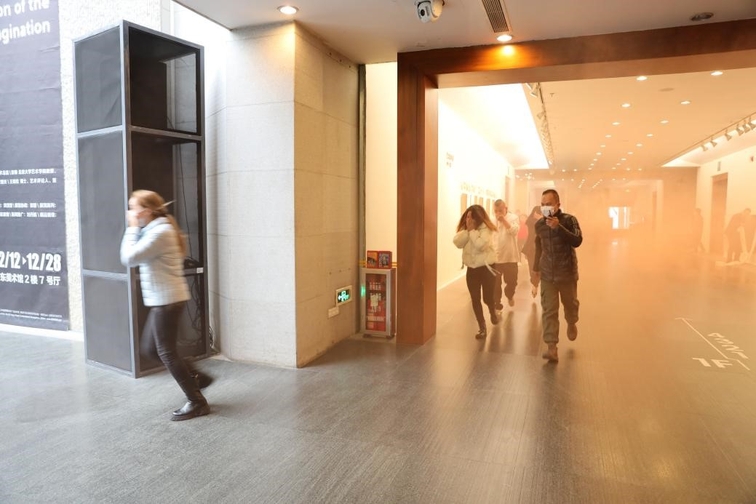 这次演练的内容有:观众应急疏散、监控室消防接警、作品保护、实地灭火、消防知识、安全生产知识培训、消防设备使用训练、虚拟火场逃生体验等。本次演练主要模拟开展期间展厅发生火情,由应急指挥部、展厅管理员、监控室值班员、保安员、展厅前台等使用应急对讲机等设备,根据本馆火灾应急预案流程,互相配合,快速疏散在馆观众和员工,同时保护部分展品撤离。演练和培训效果基本达到要求,在演练中也发现部分消防设备存在故障,已做好记录待日后整改。广东美术馆馆长王绍强在演习后作了点评,他表示在监控室(指挥部)看到员工在公众区域对现场突发事件的反应迅速、处置得当,总体上看达到了预定的效果但办公区域同事们的反应相对迟缓,须知突发事件尤其是火灾发生的时候必须争分夺秒毫不迟疑。广东美术馆开馆已二十几年,存在设备设施老化等问题,安全意识和各种反应措施要通过培训和演练入心入脑,要加倍注意安全问题,更要加强应急处置能力,做好各类预案和操练,确保安全工作到位,保障全馆上下的生命财产安全。