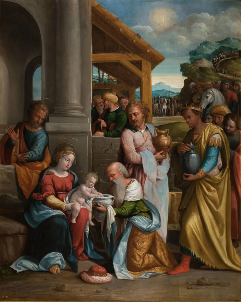 本次展出的作品《三博士朝圣》描绘的是《圣经》中的一个故事。在耶稣诞生后,三位来自东方的博士跟随一颗特殊的星星来到伯利恒,找到了新生的耶稣并且向他献上礼物。画中的三位博士在朝拜耶稣时神态各异,以不同的姿态表现出敬仰与思考,展示了艺术家对人类情感和内在精神世界的敏锐洞察,反映了文艺复兴时期对现实生活的关注和对人类精神价值的尊重。