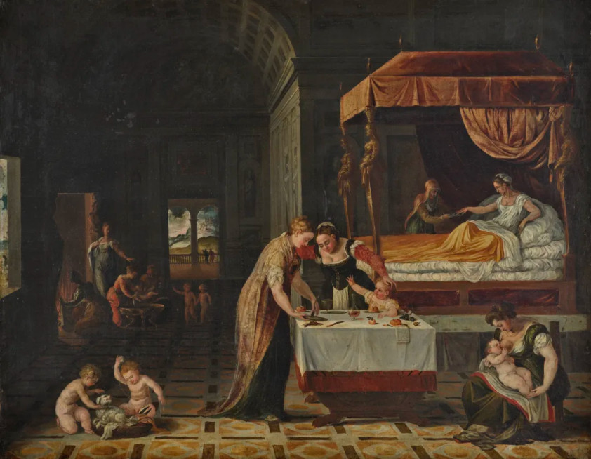 本次展览中,兰伯特·苏斯特里斯于1550年创作的布面油画《诞生》,通过线性透视,使画中的场景层次分明,空间感强烈。可以看到画中的建筑和人物按照线性规律排列,展现出一个深邃的场景,进一步增强了作品的视觉冲击力和感染力。