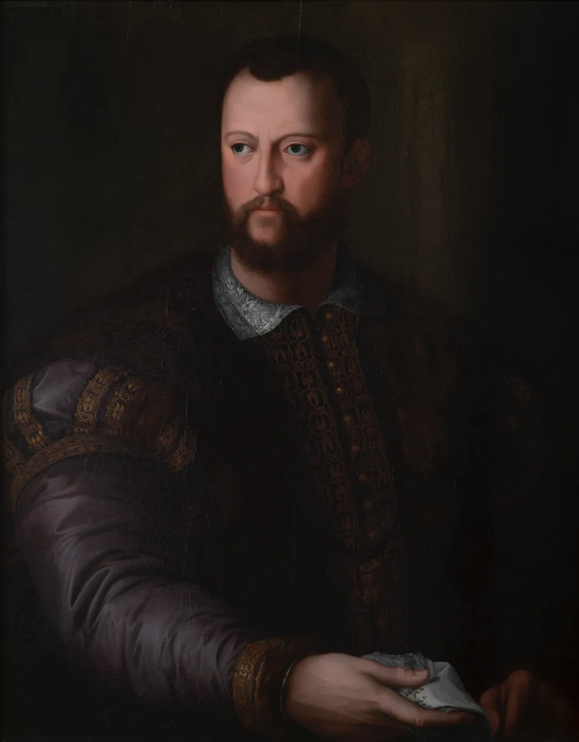本次展览的《科西莫一世·德·美迪奇肖像》是文艺复兴时期艺术家布龙齐诺于1560年作品的摹本。评论家认为其作者是布龙齐诺的合作者阿利桑得欧•阿楼瑞。这幅四分之三侧面半身肖像中,科西莫身穿用丝绸和毛皮等贵重织物制成的斗篷,衣着的装饰刻画得非常细致。科西莫试图用这幅肖像画来暗示在他统治下公国的稳定,所以这幅肖像画具有宣传性质和外交目的,经历了大量复制。