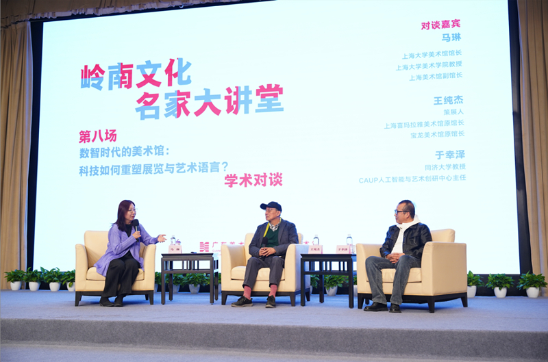 在“岭南文化名家大讲堂”系列学术脉络的持续深化中,随着对岭南画派历史本体与艺术精神的探讨渐次展开,一个更具时代性与前瞻性的命题自然浮现——当技术浪潮席卷一切,艺术的创作、展示与感知方式正经历何种根本性重构?本次讲座特邀上海大学美术馆馆长马琳作主题演讲,并与上海喜玛拉雅美术馆原馆长、宝龙美术馆原馆长王纯杰,同济大学人工智能与艺术创研中心主任于幸泽展开深度对谈。三位学者与实践者围绕“数智时代的美术馆:科技如何重塑展览与艺术语言”这一前沿课题,展开了一场跨越策展学、艺术创作与技术哲学的思辨对话,旨在探寻在算法与数据日益深入艺术核心的今天,美术馆如何保持其人文内核,并演化出新的文化生命力。