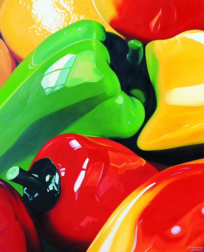 杨国辛通过对电脑处理后的图像进行手工绘制,以单纯鲜艳的色块绘出各种水果。这种鲜明的波普风格反映的是媒体传播中的消费时代,同时引导着人们的思考:消费/过度消费是否如其鲜艳的外表那样美好呢?